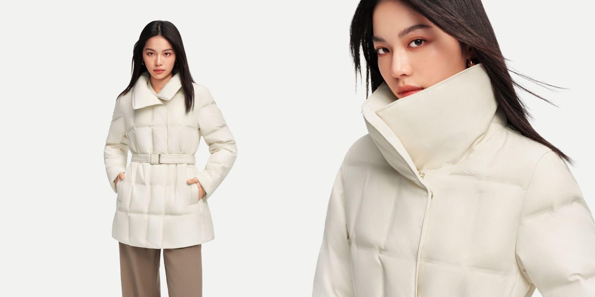 For morning commutes through to evening gatherings, this belted down jacket brings effortless style to every winter moment. Crafted from softly lustrous fabric and filled with premium goose down, the jacket delivers lightweight warmth and timeless sophistication with a flattering, feminine silhouette.