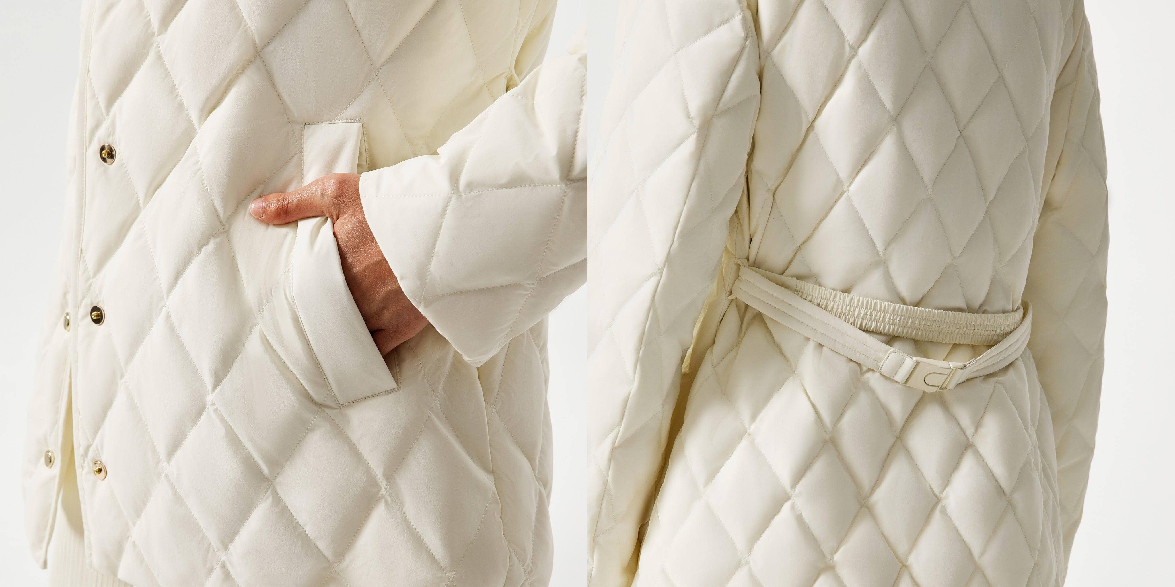 This belted jacket blends elegance and texture, featuring a detachable knitted collar and a feather-light fabric — elevated with custom accents and luxury goose down warmth. A sharp look that brilliantly combines fashion and function.