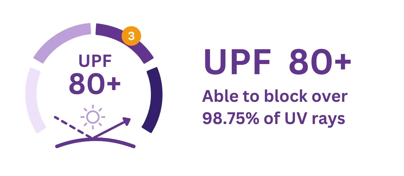 SUN PROTECTION: Ultraviolet Protection Factor (UPF) 80+ combats skin damage and ageing from sun exposure.
