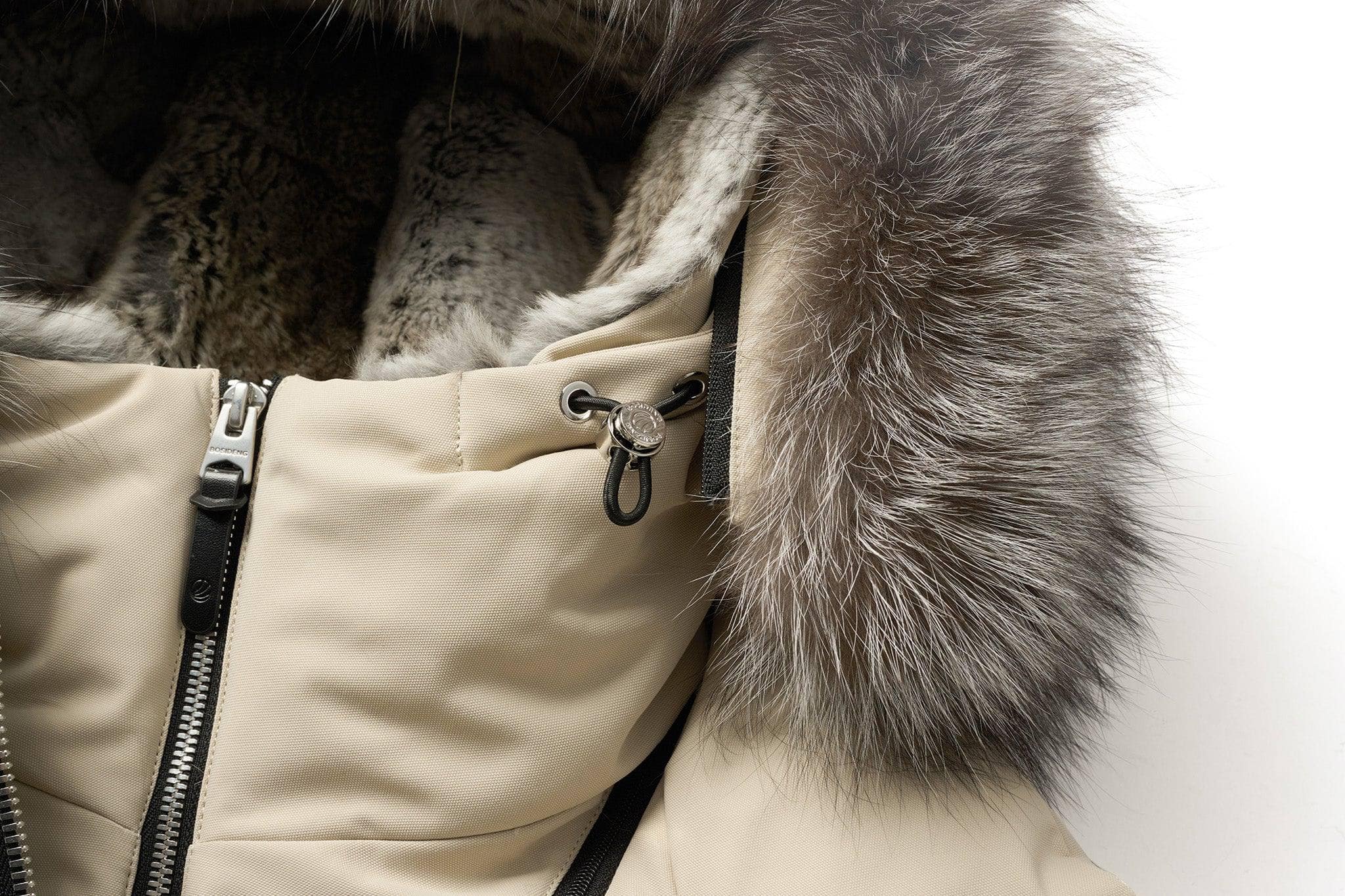 毛皮饰边:银狐毛皮,温暖舒适,触感柔滑。