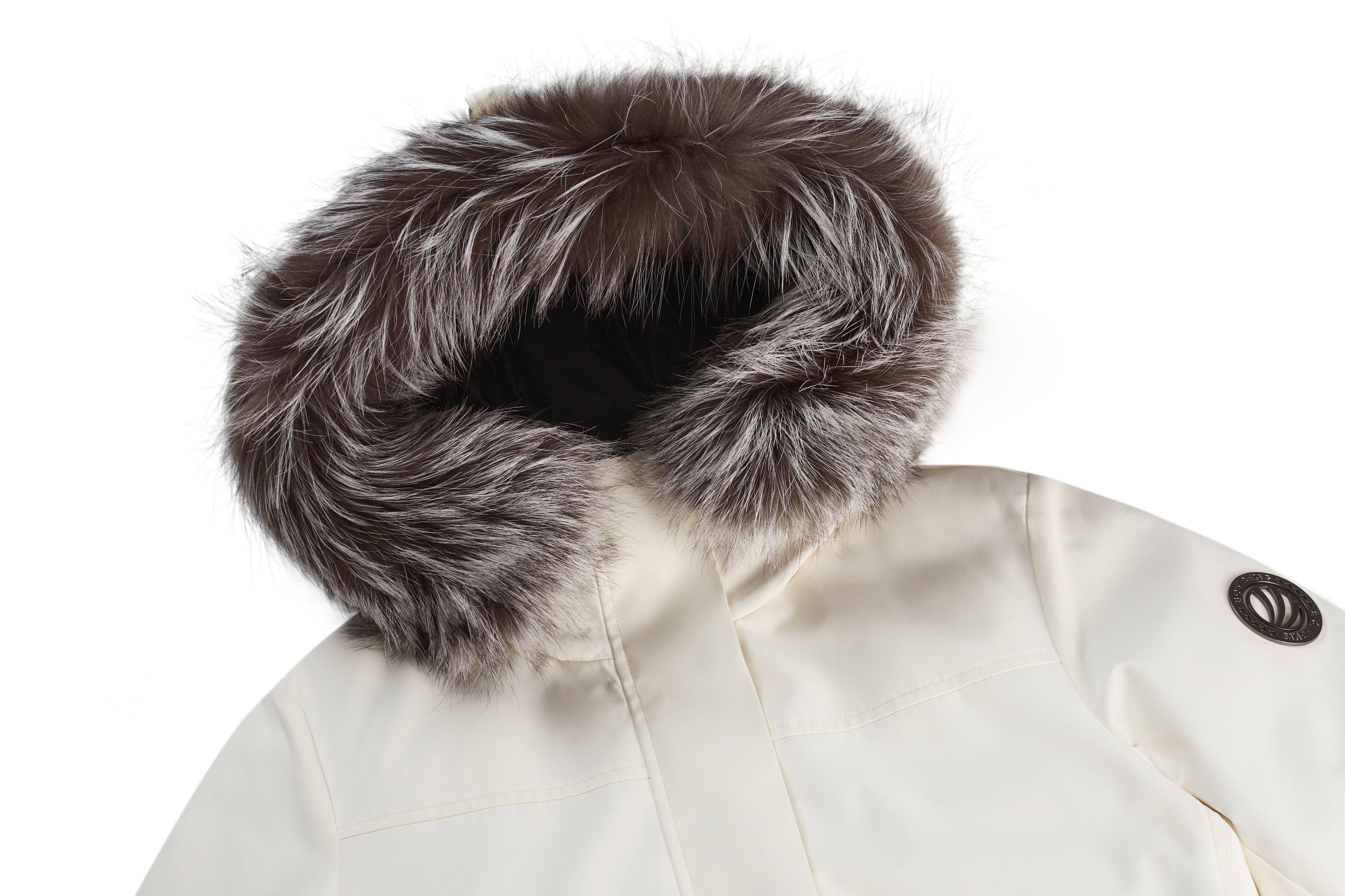 可拆卸毛皮饰边:采用银狐毛皮,温暖舒适,触感柔滑。